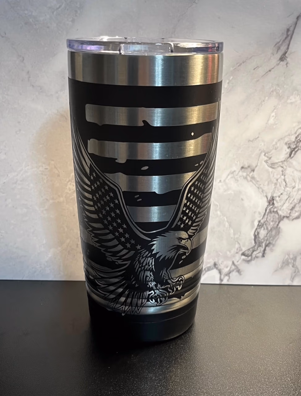 The Eagle & Flag 20 oz Tumbler boasts a stunning laser-engraved design featuring an eagle and flag, encapsulating the spirit of patriotism. This tumbler is crafted with exceptional durability and high-quality craftsmanship, ensuring it can withstand any adventure. With a practical 20 oz capacity and excellent temperature retention, it keeps your beverages hot or cold, perfect for both daily use and special occasions. Ideal for those who cherish American symbols and value superior products, this tumbler is a proud addition to the Moos Engravings collection.